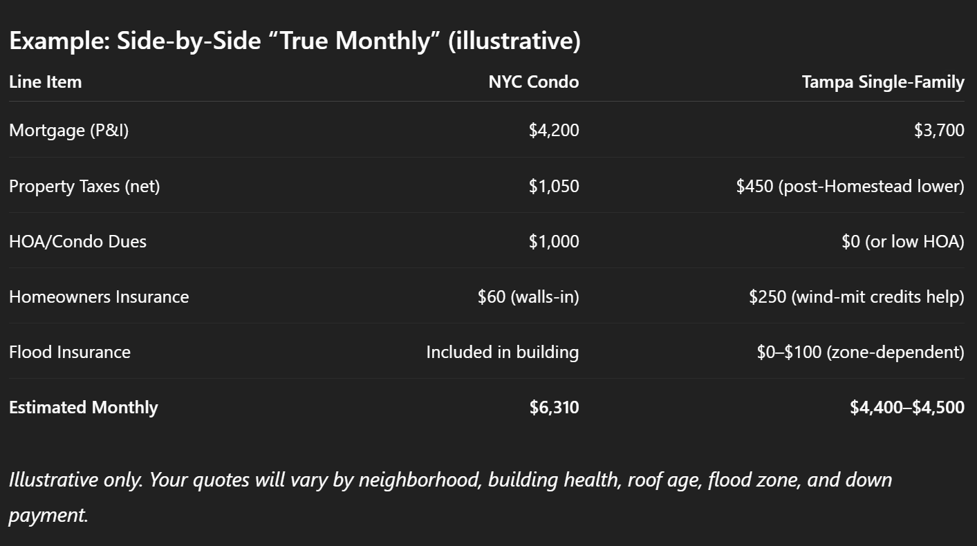 Mortgage (P&I) + Property taxes (with Homestead later) + Homeowners insurance + Flood (if any) + HOA/Condo dues (+ CDD if a master-planned community) = Real monthly you can bank on.